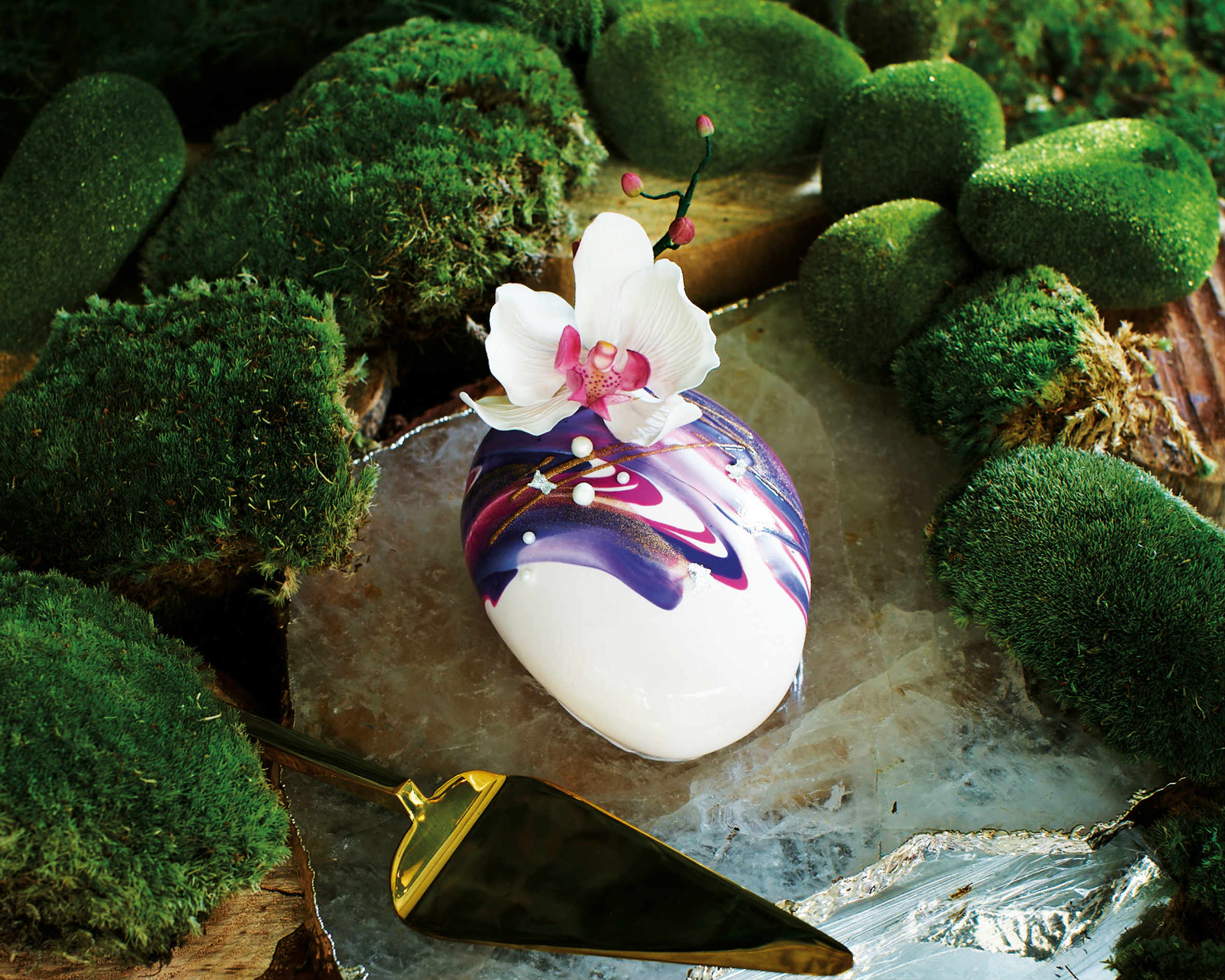 Styled and art directed by epicure’s art director, Jenn Chew, Pulse Patisserie’s Wild Orchid Cake was presented in a 'Forest Fantasia' setting reminiscent of a whimsical lush landscape. We used real moss, wooden slabs, moss-covered pebbles, reflective surfaces to simulate water, and a natural stone platter. The starring marble glaze cake, at first glance, looks like a smooth pebble with the swirls and veins commonly seen on marble, and is garnished with a convincingly styled orchid made entirely out of sugar. Playful serif fonts were used to convey the elegant whimsy of this issue, which also matches well with the font of the epicure masthead.